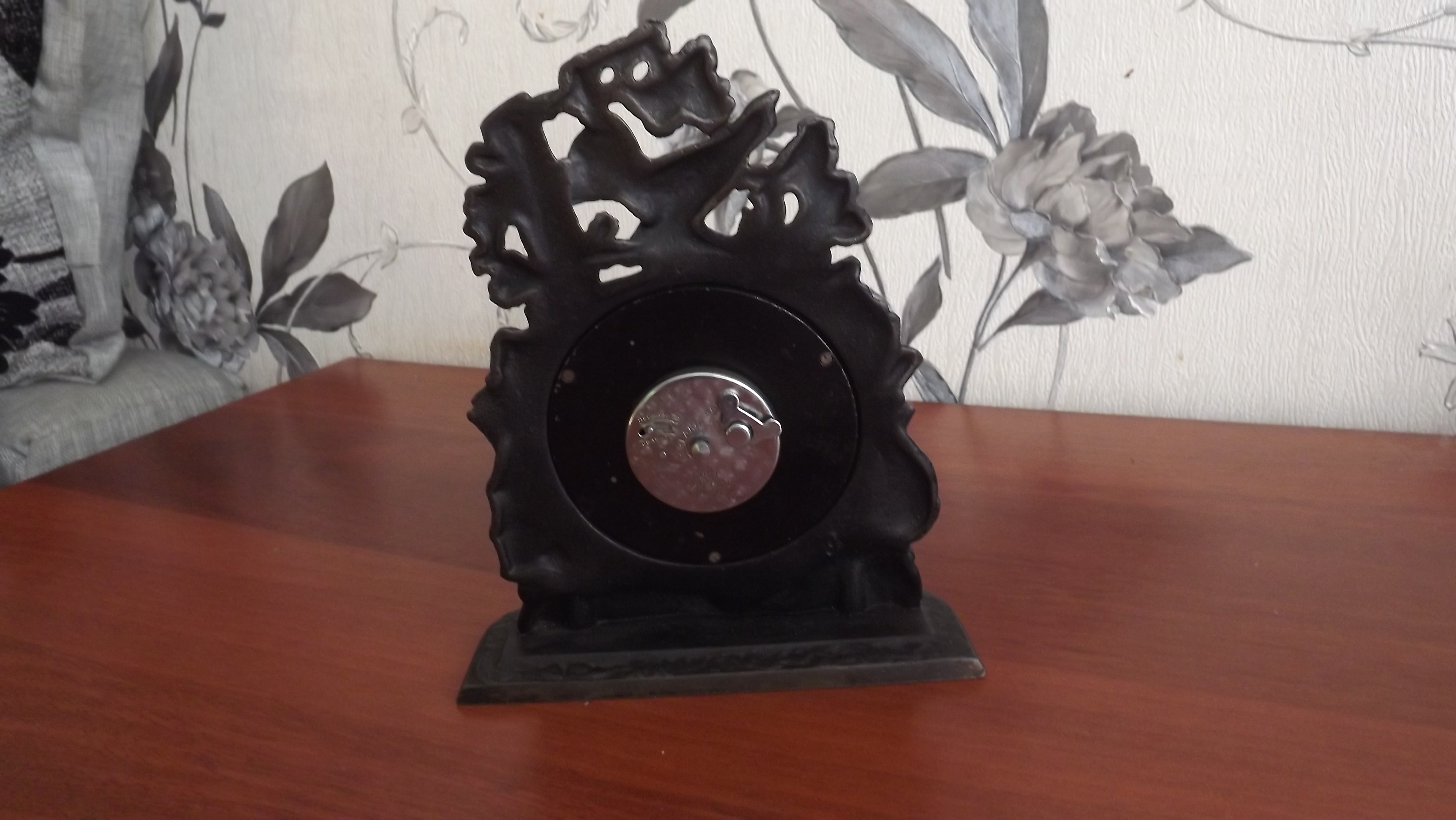 Часы Златоустовского часового завода, изготовлены в 1956 году. Часы такого типа изготавливались на заводе с 1951 года (ГОСТ-3309-51) и были отнесены по точности к первому классу. Часы изготовлены в литом чугунном корпусе, произведенном в городе Куса Челябинской области. В основании подчасника имеется клеймо КУСА и дата изготовления 1956 год. Аналогичная дата проставлена и на механизме самих часов. Крепление часов в подчаснике производится посредством массивной шайбы с помощью трех болтиков. В верхней части светлого циферблата имеется изображение эмблемы Златоустовского часового завода. Подчасник представляет из себя стилизованное изображение части хвойного дерева в верху которого изображен сидящий глухарь. В нижней части подчасника, у его основания, барельефное изображение лежащей охотничьей собаки. Вокруг часов имеются изображения предметов и вещей необходимых для охоты (слева) и рыбалки (справа). Так с левой стороны видны барельефные изображения ружья, рюкзака, ягдташа, дудки и рога для подманивания крупного зверя. С правой стороны спининг и другие рыболовные принадлежности. Такие часы пользовались популярностью у рыбаков, охотников и любителей природы.На представляемых часах усматривается не слишком аккуратно исполненная аббревиатура РК КП. Скорее всего, часы стояли в районном комитете Коммунистической партии, по сути являлись инвентарной вещью райкома.