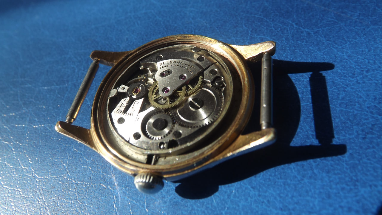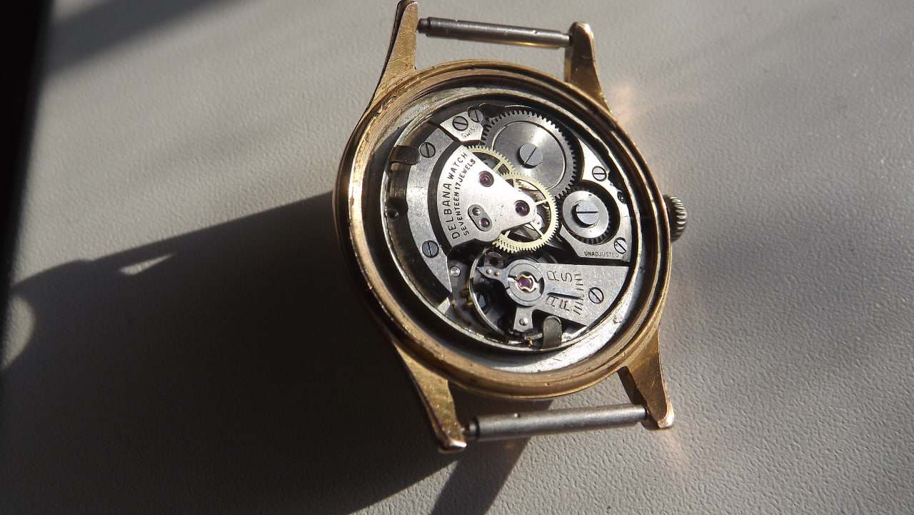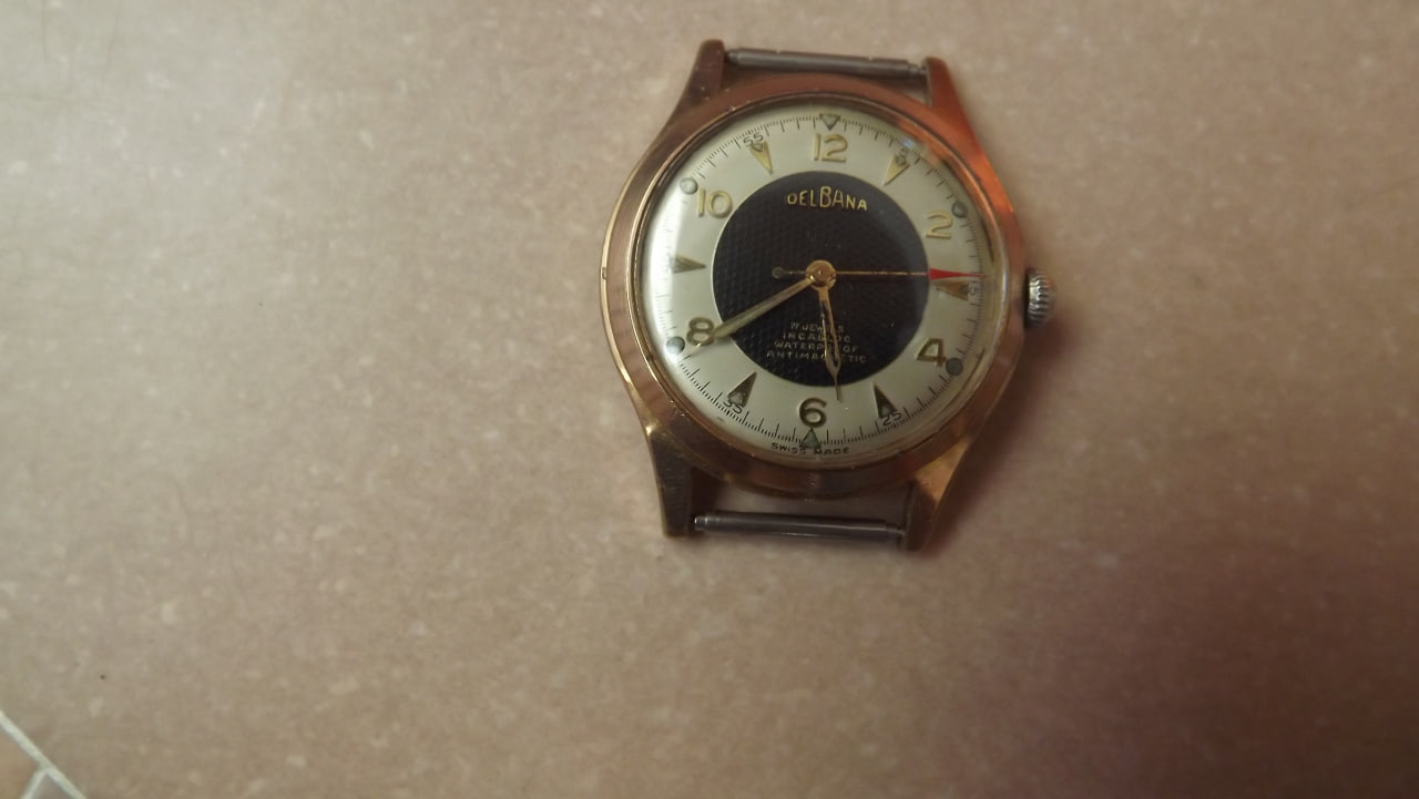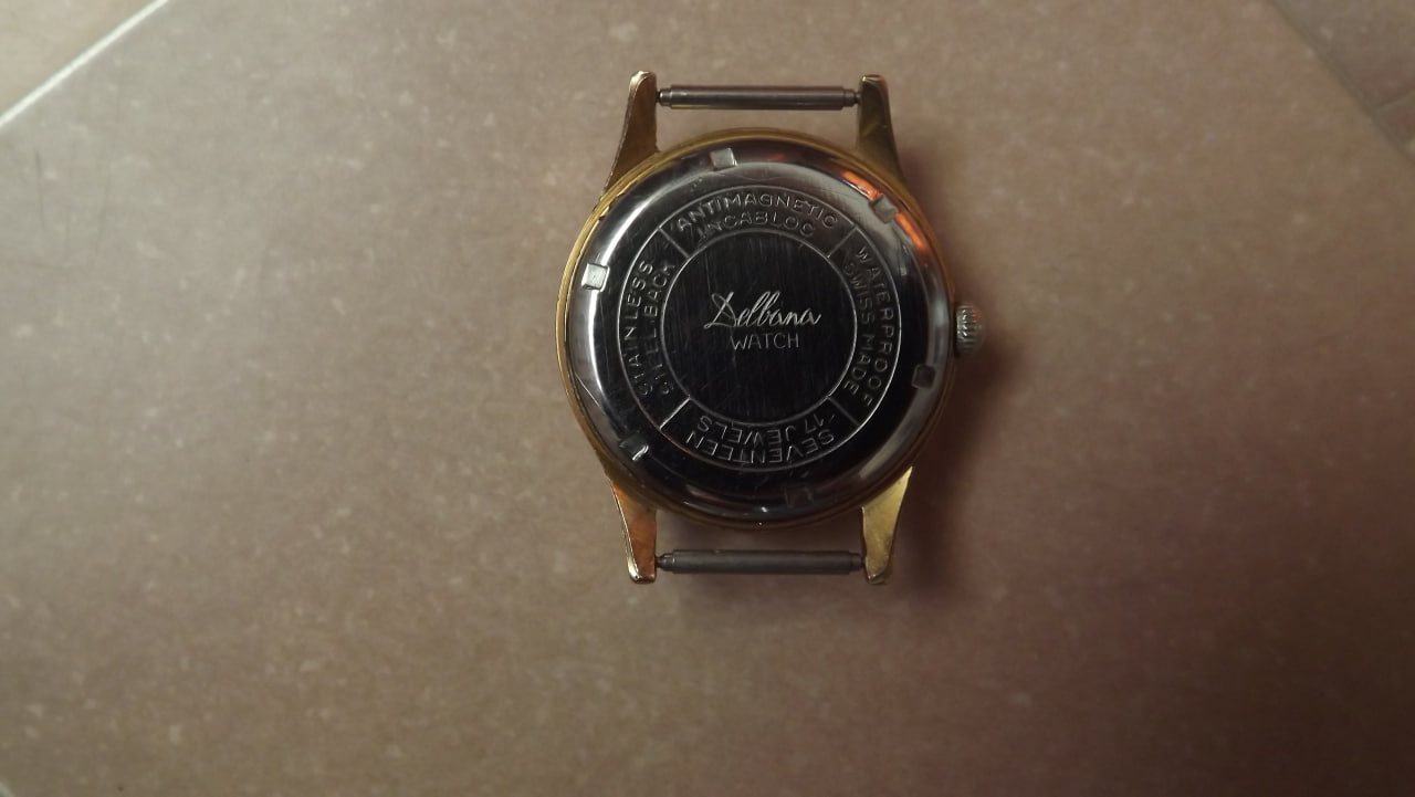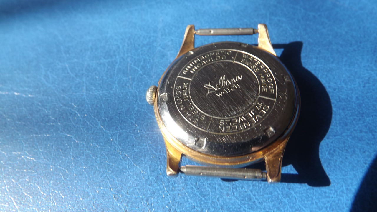 Фирма выпустившая эти часы зарегистрирована в Швейцарии в 1933 году. Создал ее уроженец Сан-Марино Голиардо Делла Бальда. Приехав в Швейцарию в 20-х годах, он поселился на Юго-Западе, где традиционно размещалось производство часов. Голиардо, поработав в нескольких часовых фирмах, сам организовал свое производство Delbana. С начала становления, до 40-х годов 20 века большой объем продукции отправлялась в страны Латинской Америки. После 2-ой мировой войны сбыт продукции был переориентирован на страны социалистического лагеря. Такие часы можно было приобрести в магазинах Березка за чеки Внешпосылторга. Поэтому сейчас их можно хоть и редко встретить на просторах СНГ.С начала 21 века эта фирма влилась в Delma Watch LTD. В настоящее время выпускаются часы, отличающиеся традиционно надежностью и качеством. Выпускаются мужские и женские часы в разных вариантах исполнения. Стоимость никогда не дотягивала свыше 1000 долларов, за исключением хронографов Melbourne из розового золота. Логотип бренда представляет собой изображение каменной башенки в щите. Башенки изображены как на государственном флаге Сан-Марино, где таковых три. На логотипе присутствует надпись прописью Delbana. Представляемые нами часы имеют лишь эту надпись. На крышке часов нет серийного номера, что свидетельствует о какой-то специальной поставке. Обычно номер на часах этой марки имеется. Часы влагонепроницаемые, антимагнитные, противоударные, последнее обеспечивается подпружиненным механизмом и отдельно камнем баланса. Механизм часов на 17 камнях, причем действительно натурально рубиновых, а не искусственных. Корпус часов с позолотой в 10 микрон.